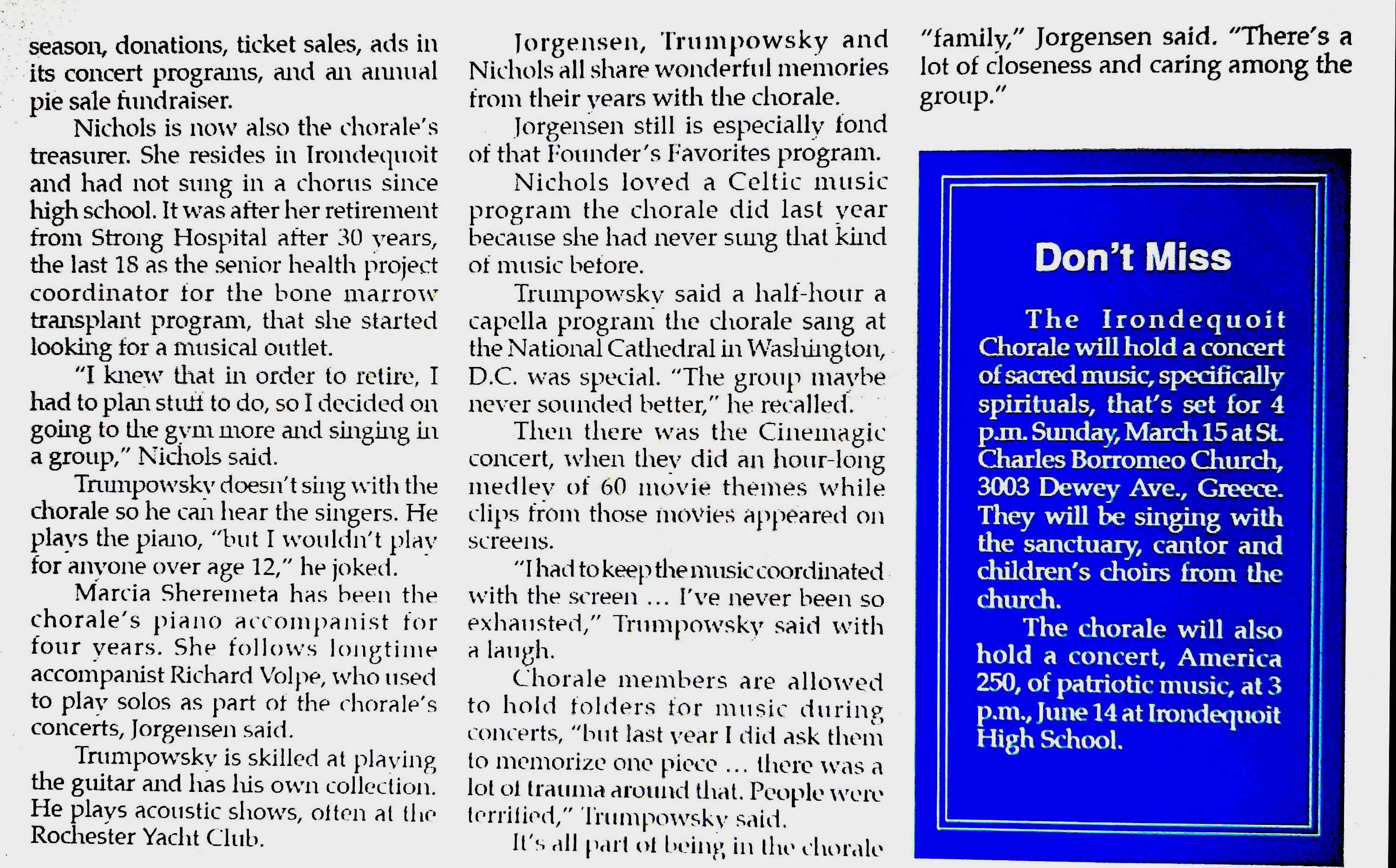Richard Volpe, an accompanist extraordinaire, passed away Thursday 8/14/2025. He was a vital member of the Irondequoit Chorale family, serving as our accompanist for over 20 years. He was also accompanist for Rochester Oratorio Society, Madrigalia, and the Rochester Bach Festival Chorus. He taught at Eastman and Hochstein, and also privately for many years. He was a concert pianist, performing twice in Carnegie Recital Hall in New York City. I was blessed and honored to work with him for so many concerts, as he elevated our performances with his musicianship. He was a close friend who deeply cared about the members in the group. Before each rehearsal he asked about how my family was doing, especially when my children were young. We plan to honor his legacy at our March 2026 concert this upcoming season. Richard, you will be missed but never forgotten.